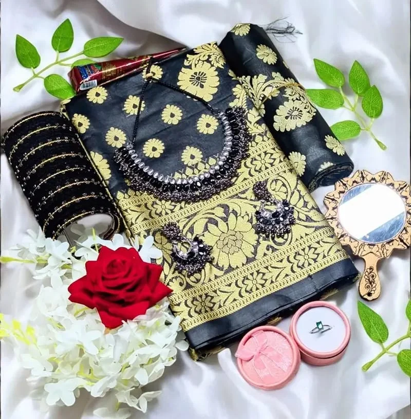 কালো মানেই আভিজাত্য! আপনার প্রিয়তমাকে একটি ক্লাসি এবং রাজকীয় লুক দিতে আমাদের এই Black Saree Combo টি সেরা পছন্দ। জন্মদিনে বা বিবাহ বার্ষিকীতে তাকে সারপ্রাইজ দিতে এটি নিশ্চিন্তে বেছে নিন।